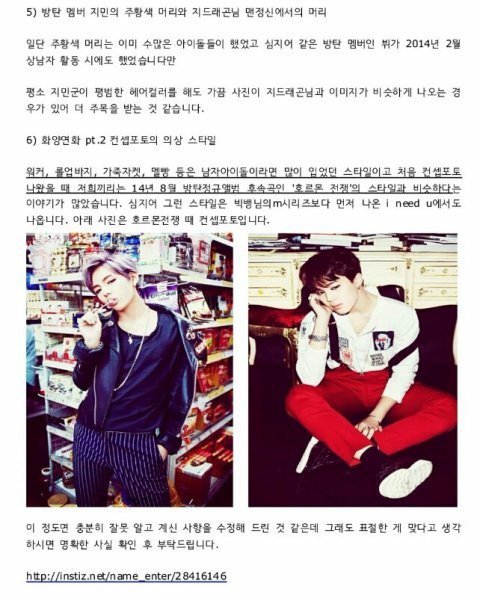 샤1이니의 의상과 같다는 농구복은 당시 이미 유행하고 있었으며, 타아이돌분들도 입으셨던 옷과 같음(머리채x). 만약 따라 입었다 할지라도 사진 속 정국은 상의만 같을 뿐 모두 다른 스타일링으로 표절이라 볼 수 없음.