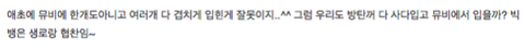 이 반박문을 읽고나서도 이해가안되고 그냥 따라하는 것처럼 보이는 타팬분도있을 거 예상하고 있어요. 팬톡에서는 빅히트에 메일총공이라도 해서 사태를 알리자는 의견도 나오고있습니다. 이 글이 퍼지고 나서도 논란이 계속된다면 빅히트에게 직접 알리는 조치를 취하겠습니다.