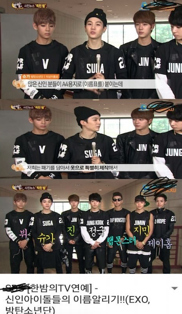 아래 방탄 사진은 서머 패키지에서 나온 사진이지만 방탄은 데뷔초부터 리허설 때 단순히 이름표를 부착하는 게 아닌 직접 이름이 적혀진 티를 입었었음