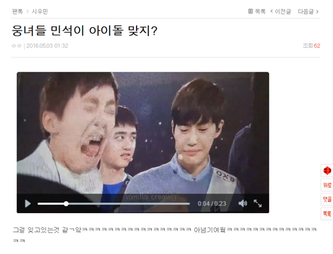 오늘 민석이 벌칙받는 화면 저렇게 캡쳐해서 아이돌인걸 잊었다고 돌려까기 중임 삭제해 달라는데도 반응없고 밑에 댓글로도 등장해서 역시 팬코하고 있어 자세히 보면 쓰는 단어들이 유사하다는 걸 느낄꺼야 웅녀들 우리는 민석이 어떤 모습이라도 당연히 귀엽지만 ㅇㄱㄹ들은 저런 캡쳐 만들어서 퍼나르면서 민석이를 깍아내리려고 든다는 거 다들 알고있지? 조회수 올려주지 말자 대꾸도 말고