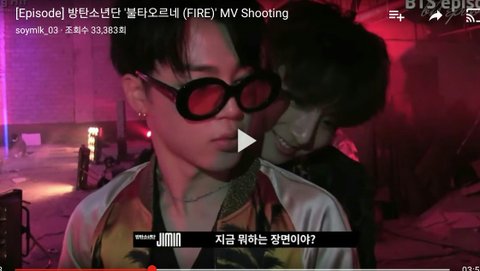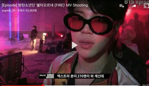 지민이가 뮤비에 엑스트라분들과 함께 찍는장면 설명중..