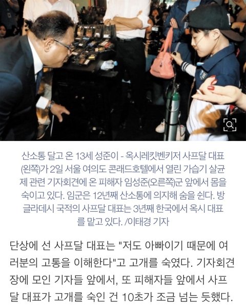 6. 그리고 5년만에, 이제사야 옥시임원의 사과가 나옴. 그치만 공식 석상에서도 가습기 살균제와 폐손상의 연관성은 부인. - 이게 소송의 승패를 결정짓는 핵심이니까.