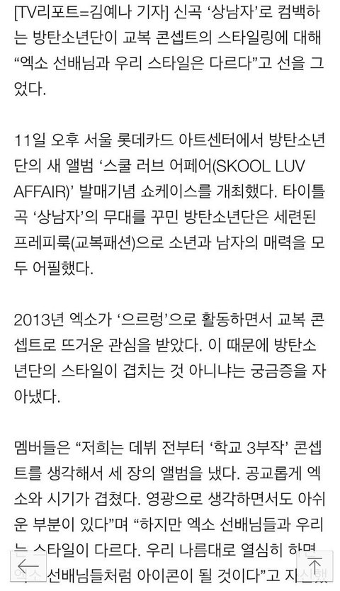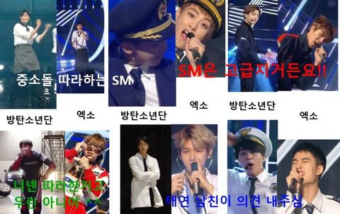 방탄은 각자일하는파트에서 쩐다는 의미로 직업군별로 입은건뎈ㅋㅋㅋㅋㅋㅋㅋㅋㅋ 엑소는 노래내용이랑 상관없는데도 이 의상을 입었네 그것도 멤버별로 존똑으로