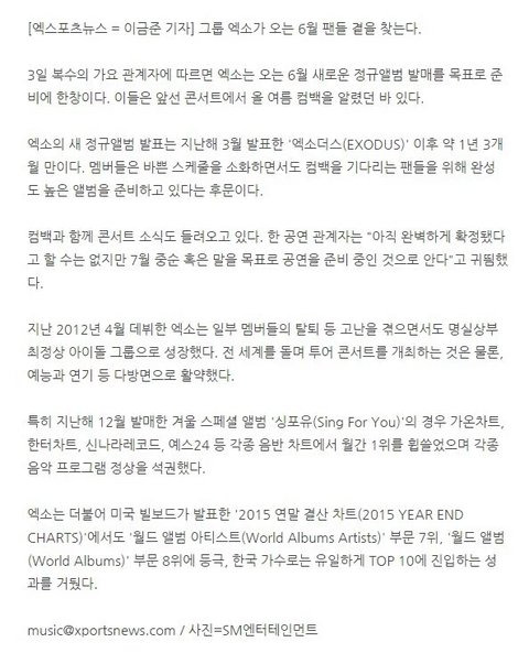 [단독] 엑소가 돌아온다…6月, 정규앨범으로 '컴백' (출처 : 엑스포츠뉴스 | 네이버 뉴스검색) https://t.co/RLvRkqdkkS