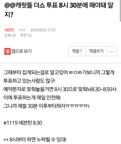 ㅌㅇㅇㅅ 분들은 문자투표때문레 저번에 아깝게 1위 못했던걸로 알고있고 ㅂㅅ분들은 이번주가 마지막활동이라서 다들 열심히하고계신것같은데