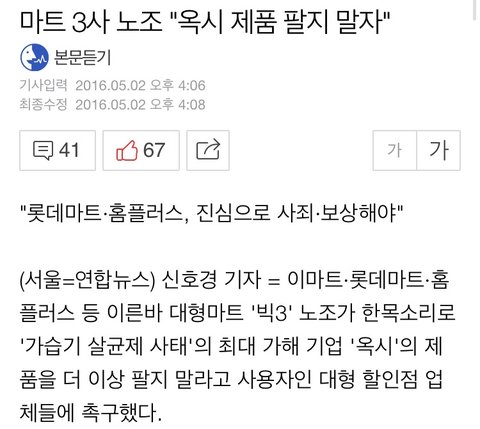 1. 3대 대형마트 노조 (이마트, 롯데마트, 홈플러스) : 옥시 제품 판매 중지하라고 업체에 촉구함.