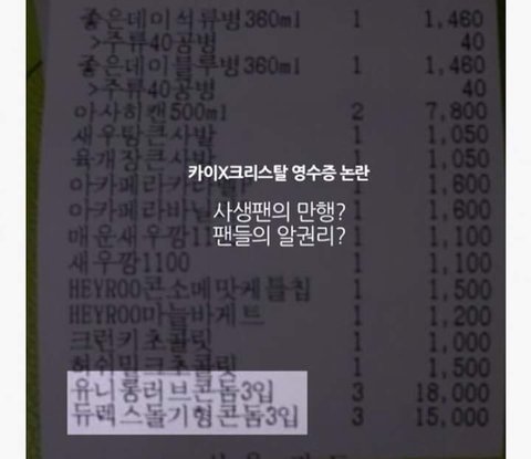 저거 영수증 올린사람 주작인거 들키고 글 내렸는데ㅎㅎ저 영수증으로 인증이 되는거면 나도 아무거나 사고 종인이랑 마트 데이트~♡이러겠다ㅋㅋㅋㅋㅋㅋㅋㅋ차라리 편의점 cctv돌려서 캡쳐를 하지~수영장도 앞모습을 보여주던가 뒷 모습 가지고 누구녜 마녜 궁예질 하는거 너무 웃기고 저런 사진을 몰래 찍은 사람이 비판 받아야되는거 아닌가ㅎㅎ?그리고 쟤들이 그걸하던 말던 뭔 상관인지도 모르겠고~팬이 알권리는 무슨 저런거 안알려줘도 되니까 걍 루머면 올리지나 말자ㅎㅎ
