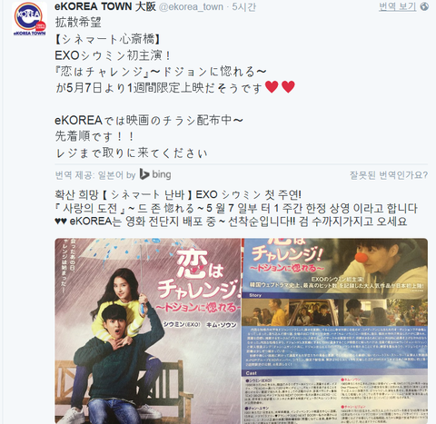 웅녀들 내가 트윗에서 지금 봤는데 나도전이 28일(토)부터 후쿠오카 kbc시네마에서도 상영이 결정되었대(기존 후쿠오카상영관아닌 다른 곳이라고 함 그러니까 추가된거) 그리고 밑에 짤은 아마 지난번에 공고났던 시네마트 신사이바시 나도전 추가상영 홍보! 오사카에서 상영하기로 했던 곳은 원래 토호시네마 난바상영관이랑 우메다였는데, 5월 7일 내일부터 시네마트 신사이바시상영관이 추가된거래!!! 암튼 5/7 오사카와 5/28 후쿠오카에서 추가상영되는 도전반('사랑의 도전')좋은 반응 있기를! 도전이 슈이팅!!!!(천사웅녀님의 댓글 보고 설명 덧붙였어>.<)