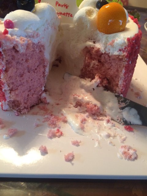 파리바게트 신트리점에서 딸기 생크림 쉬폰 케이크를 5일 저녁에 사서 냉장고에 넣은후 6일 5시30분경 꺼내서 잘랐더니 생크림이 물처럼 나와서 문제가 있는거 같아서 전화를 했다