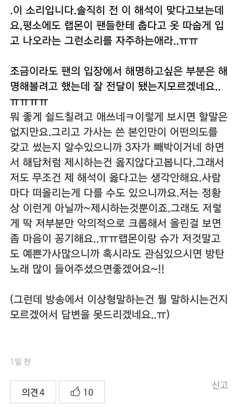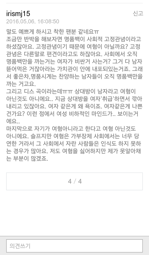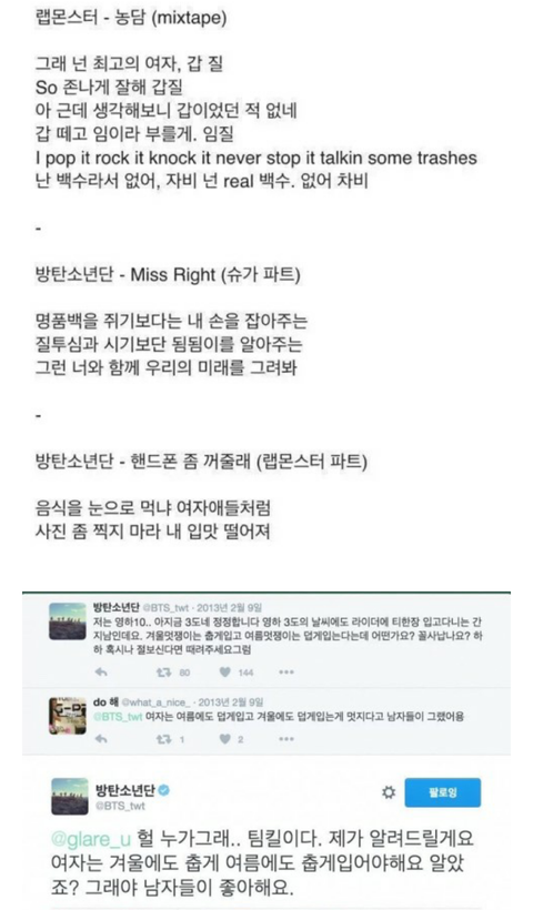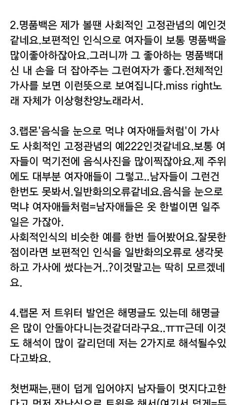 반박 못할만큼 깔끔하게 정리하고 싶어서 찾다가 지쉭인에 누가 여혐논란 팩트로 정리해달라고 올린걸 봤어 근데 거기 답변자(아미)가 정리 잘해놨길래 혹시 써야할 때 있으면 쓰라고ㅎㅎㅎ