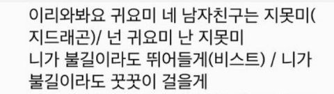 ㅂㅌㅅㄴㄷ의 ㄹㅁㅅㅌ님께서 빅뱅 지드래곤분의 가사의 문장구조와 매우 유사한 문장구조를 쓰셔서 의견을 묻고싶어서 들립니다 이 가사의 문장구조를 검색해보니 지드래곤분의 노래와 그 사람들의 노래 포함 3곡만 나왔고요 지드래곤 분께서 처음 사용하신 문장구조인데요 저희도 저쪽이랑 그 일로 약간의 마찰을 겪고 있어서요 이거에 대해서 저희 쪽 어떤분이 의견을 묻고 오라하셔서 묻습니다 혹시 빅뱅팬분들께서는 이 가사에 대하여 어떻게 생각하십니까? ㅍㅈ이 아니라고 생각하신다면 저희는 더 이상 묻지 않겠습니다