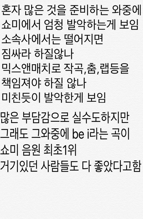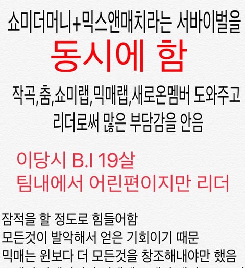 비아이는 혼자 작곡하고 춤짜고 심지어 리더라서 애들한명한명 봐주면서 가르처줬어야 한거죠