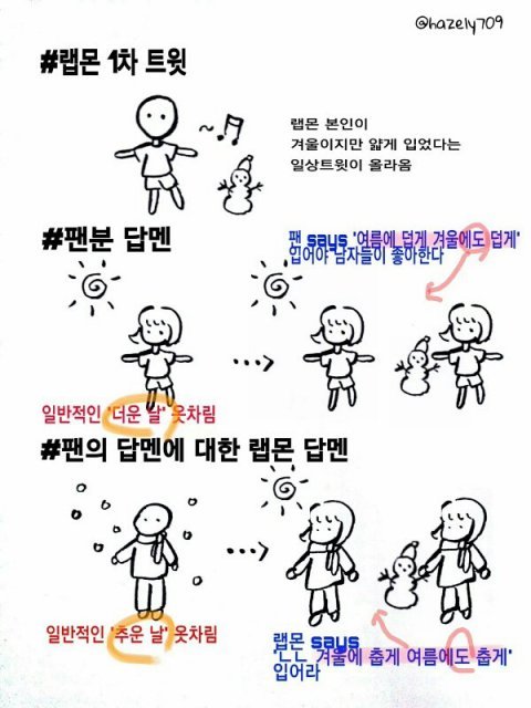 미안한뎅 ㅠㅠㅠㅠㅠ 친구가 ㅇㅅ이고 ㅂ 이라 이번사건에 다연관됌ㅋㅋㅋㅋㅋㅋㅋㅋㅋㅋㅋㅋ 이얘기하면서 공인이 왜 그런말쓰냐그래서 저 짤도보내주고 저문장으로만보면 여름도,겨울도 얇게입어야 남자들이 좋아한다라는 문장인데 그앞에 팀킬당했다는얘기가들어가면 상황이달라진다고 랩몬이말한 춥게는 추울때입는옷차림 이라고설명했는데 1차원적으로 해석했을때 저렇게 해석되냬 ㅋㅋㅋㅋㅋ 뭐라반박해 ㅠㅠㅠㅠㅠㅠㅠㅠ?