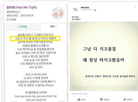 왼쪽은 2015년 7월 1일에 나온 맨정신 뮤비, 오른쪽은 올해 나온 화양연화 pt.2