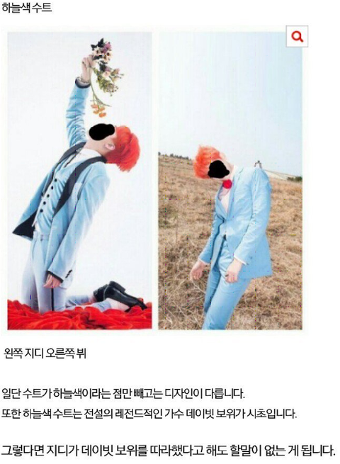 일단 수트가 하늘색이라는 점만 빼고는 디자인이 다름 또한 하늘색 수트는 전설의 레전드적인 가수 데이빗 보위가 시초임