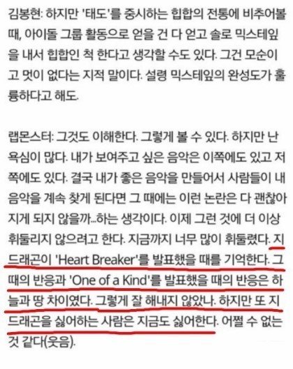 이거 보시면 아무 생각 안 드십니까? 하트브레이커때 지드래곤은 수많은 악플과 욕설과 비난으로 욕을 먹고 정신적으로 많이 힘들어했던 시기였습니다. 그 과정을 빂분들도 지켜봤고 꺼내고 싶지 않은 내용일텐데 과연 인터뷰에서 저 내용을 언급하고 경솔하게 발언하는 이유는?