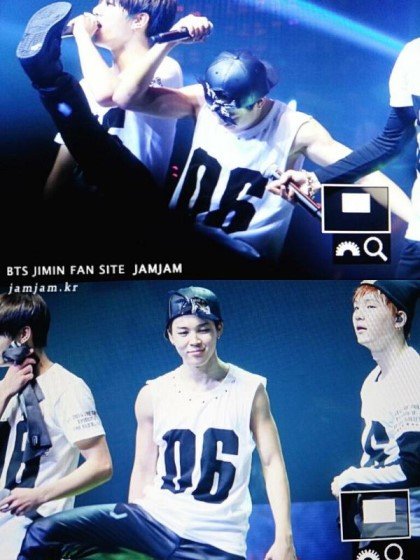지민이는 아예 민소매를 입는 등 일률적으로 맨투맨을 입은 엑소와 달리 방탄은 멤버 개성에 맞는 스타일로 변형해서 무대의상을 입었습니다