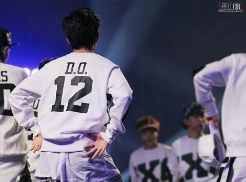앞모습은 엑소 글자, 뒷모습은 멤버 이름을 작게 적고 멤버별 숫자를 프린팅한 옷을 입었고