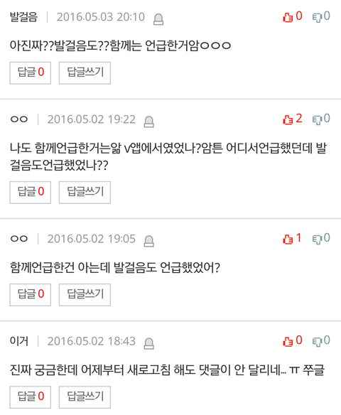 진짜 찾고찾고 물어봐도 아무도 모르는거야ㅜㅜㅠㅜㅠㅠ 그래서 솔직히 포기했는데... 댓글도 안달리고 그분들 팬톡가서 물어봐도 함께 언급영상밖에없구.. 그러다 그냥 오늘 내가 쓴 글 다 보고있는데 그 글에 댓글이 안달려서 휴ㅠㅠㅠ 했는데 달려있길래 봤거든?? 근데 나만 궁금한게 아니였어 ㅠㅠㅠㅠㅋㅋㅋㅋㅋ 근데 함께말구 발걸음이고 내가 어디서 봤는지 사진으로 올릴게