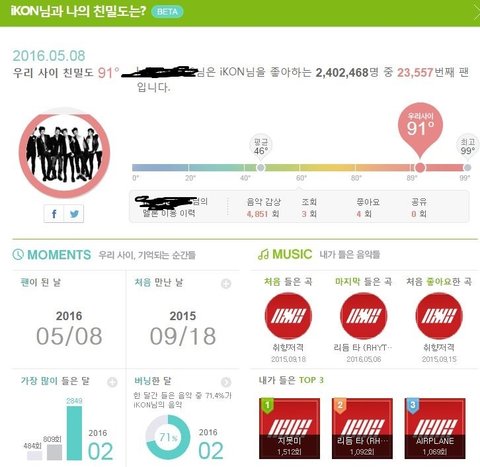 마이뮤직 -> 팬맺은 아티스트 -> 나와의 친밀도 더 보기 누르면 되더라고요