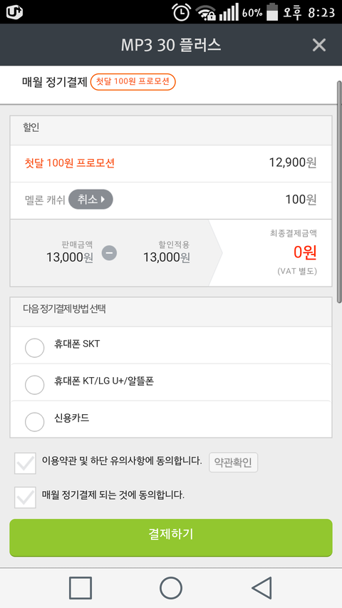 지금 멜론에서 할인하는거 100원짜리 사려고 하거든? 근데 내가 미성년자에ㅣ다 통신사가 유플러스임! 그래서 폰으로 정기결제를 못해!!!!!!!!!! 오마이갓!!!!!!!!!!!!! 학생피릿들 너네 정기결제 어떻게 하고있어??