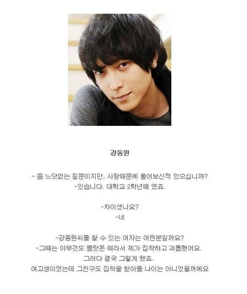 미안한데 이거 루머임ㅋㅋㅋㅋㅋㅋ강 조카 팬들이만든거라구요 ㅋㅋ강동원 여고생이랑 사겨본적만있다고했지 저런인터뷰는한적없음