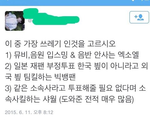 작년에 빅뱅이랑 붙었을 때 샤이니 팬들이 자기들한테 문투 안해준다고 시비걸고 욕함. 샤이니 팬들은 엑소에게 투표해줄 이유도 없고 의무도 없음. 누구에게 하든 그건 자유임