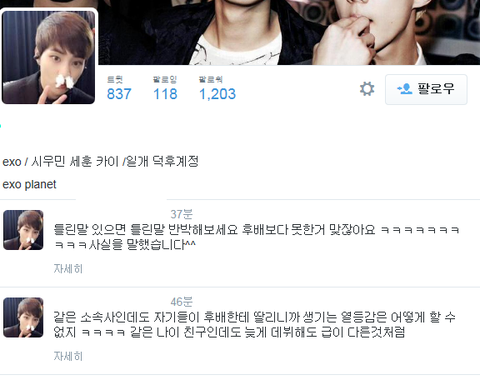근데 안해줬다고 자기들보다 못나가는 퇴물이라고 욕하고 조롱하는 글이 리트윗 천개 넘었음. 심지어 종현한테까지 직멘해서 엑소한테 곡 준거"는" 고맙다고 건드림