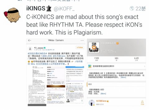 댓글에 있는거 추가+) 이건 중국가수가 올린 글인데 "들어봤는데 제 개인적인 판단기준으론 이곡은 작곡면에서 아이콘의 리듬타를 카피한거 확실한것 같아요. 곡 구성, 박자(BPM까지 똑같음), 편곡방식 (드럼색깔의 선택도 똑같음). 이상황은 예전에 하이민웨이(중국가수이름)의 곡이 위너(Winner)의 척이란 노래를 표절한것과 비슷하다." (은 위너 데뷔앨범 수록곡) 중국가수도 중국곡이 아이콘을 표절했다 함.
