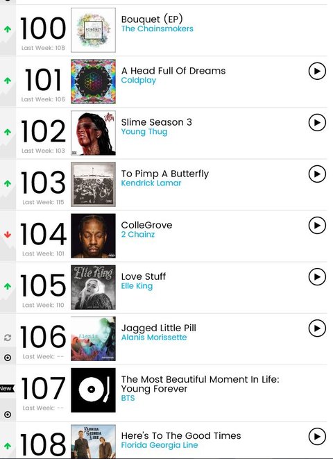 방탄소년단 영포에버 빌보드200차트에서 107위