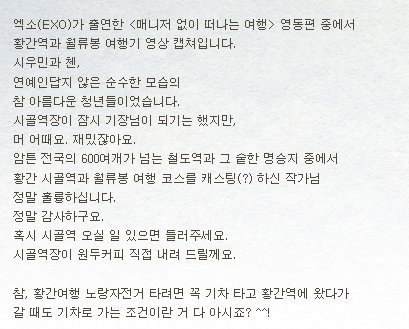 잠시 기장님이셨던 황간역장님께서 순수한 모습의 아름다운 청년들이었다고 블로그에 후기 남겨주셨대 ㅋㅋ 사실 매떠여 보면서 나도 생각했었거든 민석이가 비행기를 주로 타고 다니니까 역장님보다 기장님이 익숙하구나 하고 ㅋㅋㅋㅋ 김형제 사진도 그렇고 팬들이 들고 간 인형까지 찍어서 자전거에 정성스레 붙여주셨다는 역장님 센슈있으신 듯! 참, 요새 영동으로 여행가는 팬들 많은데, 노랑자전거 대여는 기차타고 황간역을 왕복하는 여행객들을 위한 이벤트란 거 잘 기억하자 민석이랑 종대는 촬영이었으니까 승용차를 타고가서 자전거 탔지만 말야 >.< 매떠여 또 보고싶다 민석이는 더 보고싶고 ㅠㅠㅠㅠㅠㅠㅠㅠㅠㅠㅠㅠ (후기 캡쳐는 트윗에서 펌)