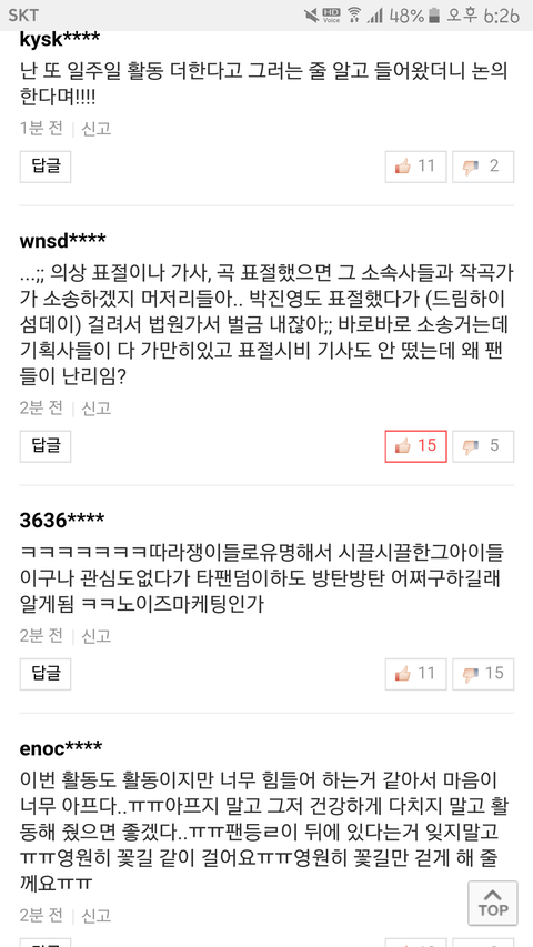 네이년 애들기사에 달린 댓글인데 이게 맞는말이지.. 남들이 표절이네 뭐네 해서 혹하지말고 억지인거 구분잘하자 노래표절뜨고 광고네 뭐네 표절뜨는건 아닌거같아 그컨셉은 피드백요청했으니 기다려보고 딴거 표절로 시비거는거는 상대하지말고 마이웨이하자 그냥 스밍은 컴퓨터로 해서 상단바에 없어ㅠ!