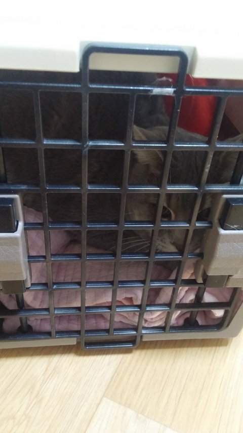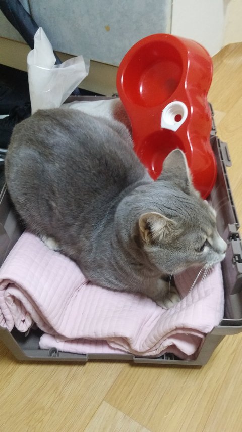 이동장에 이불 깔아놓고 쓰던 모래랑 밥그릇이랑 빗이랑 함께요.