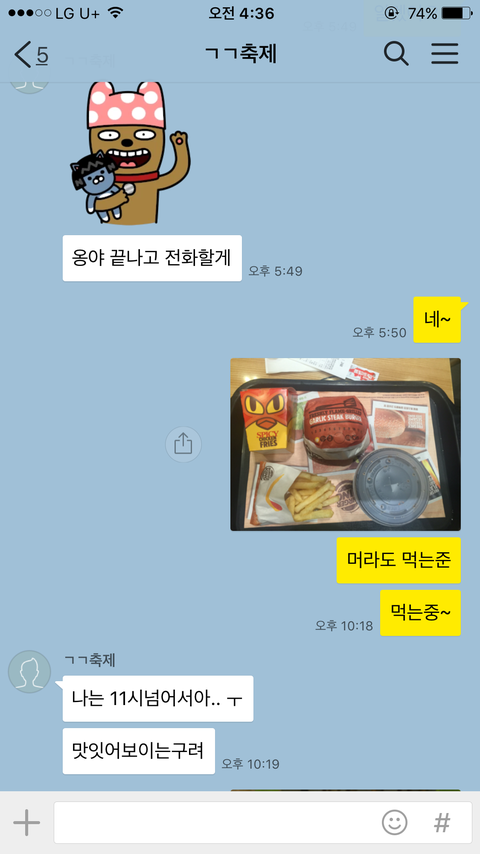 저는 버거킹에서 햄버거를 먹는다고 톡으로 보냈고요.