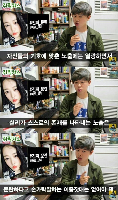 왜까? 난 같은여자로써 설리가 그렇게 당당한거 멋있던데? 스무살넘은 성인여성인설리한테 자꾸 소녀성을 강요하는 니네가잘못된거라곤 생각해본적없어? 자꾸 예전의분위기가 없어졌다고 어렸던 설리가좋다고 그러는데 난 지금의 성숙해진 설리도좋다. 자꾸 얌전한거 소녀스러운거 여성적이지않다고 그렇게 까내리고 강요하진 않았으면좋겠다. 나는 설리처럼 당당한 여자아이돌 처음본다. 설리가 당당한게아니고 설리의행동이당연한거지. 표현의 자유잖아 자기 인스타에 뭘올리던. 우리가 보수적인거야. 여자아이돌이 저래도되나? 야 그럼안되냐? 여자니까? 아이돌이니까? 설리가 나이많은남자랑 연애해도 어떠냐. 나는 나이많은남자랑 사귀기싫다. 개인적으로 극혐인데 하지만 설리랑 최자가 좋다는데 우리가뭔상관? 그리고 몇일전에 기사를읽었는데 정말공감되더라. 스무살넘은여성에게 소녀성을강요하는 사람들... 나도 얼마전까진 설리 쟤 대체 왜 저러냐? 주의였는데 진짜로 생각이 바뀌고 머리가 멍하더라. 잠시나마 설리를 욕한 내 자신이 부끄러웠다. 그리고 지금은 같은여자로써 대단하고 부럽다고생각한다. 니네도 이사진들보고 생각좀 바꿨으면 좋겠다.