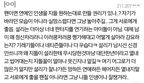 특히 여자들. 같은 여자로써 설리를 욕할게아니라 저런당당한모습에는 멋있다고해주자. 내말은 설리의행동이 다옳고 설리가 다 잘했단게아니다. 그저 아직도 여자에게 조신함과 여성스러움 그런걸강요하는대한민국에서 저렇게 당당한 여자공인이 있다는게 대단하다고생각해. 도를 지나치는것만아니면 괜찮은거잖아. 다들 생각을 바꿔보는게 어떨까?