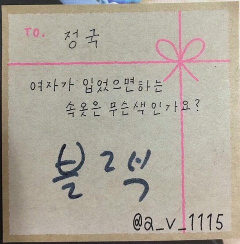 정국이 글씨저렇게 안씀 그리고 정국이가 답을 썼다고 해도 팬싸니까 답을해줘야된다고 생각함 안그러면 섬녀들이나 안티한테 인성어쩌고저쩌고 로 욕먹을껀데 이거가지고 뭐라뭐라 하는사람들 이해가안됨..