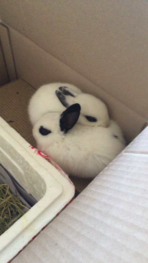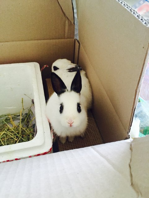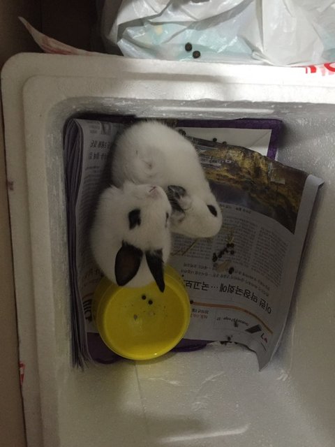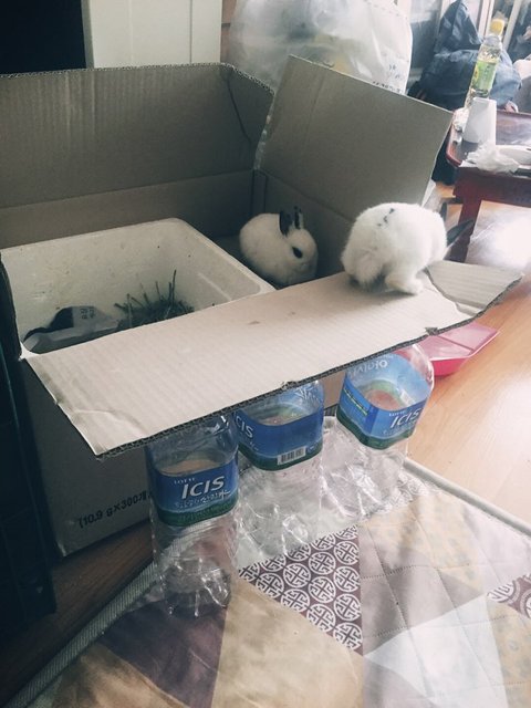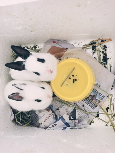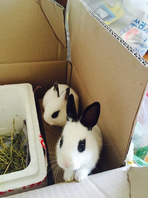 이런 스티로폼 박스에 건초 두봉지와 토끼 두마리가...