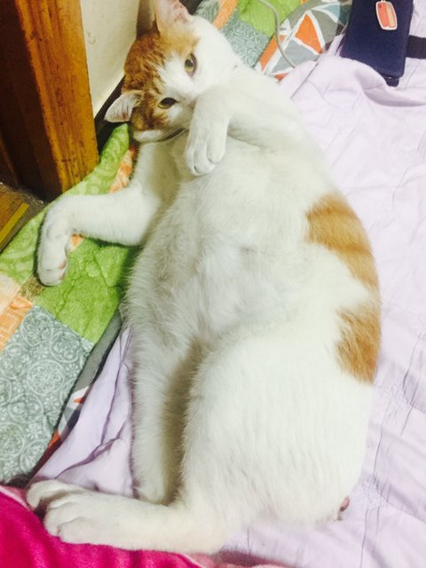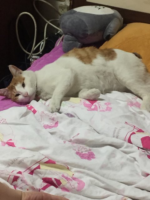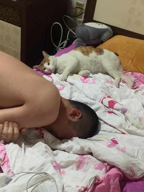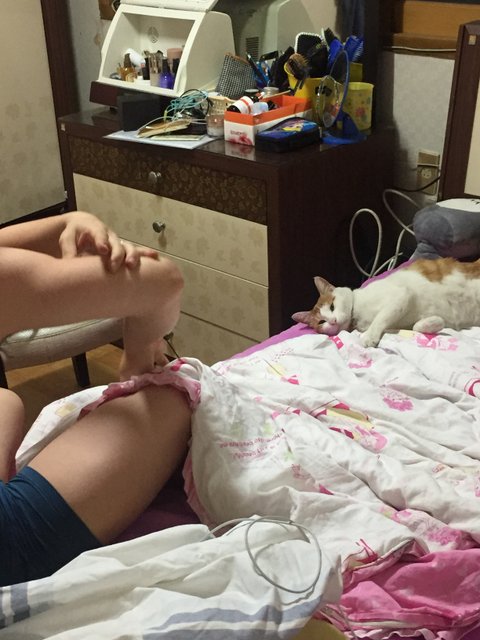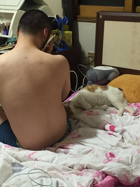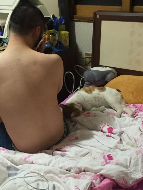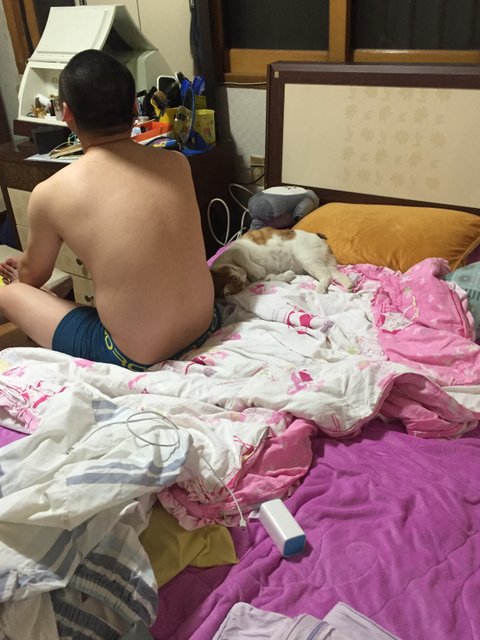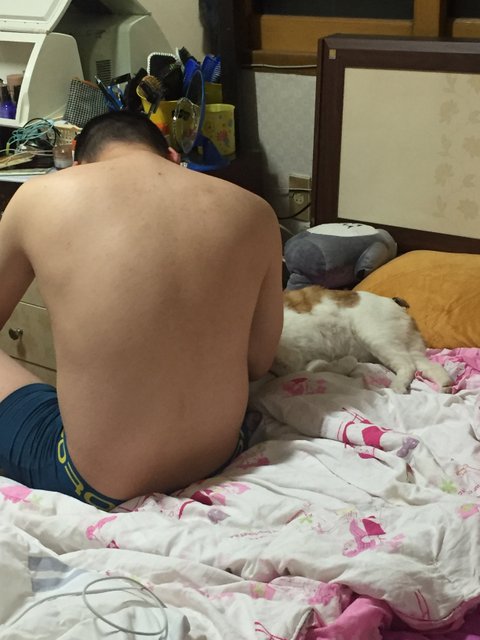 눈깜빡할사이 빡빡이가 침대를 뒹굴고 있었다