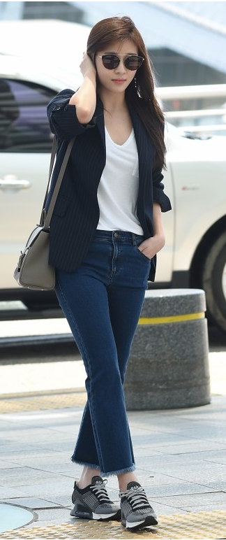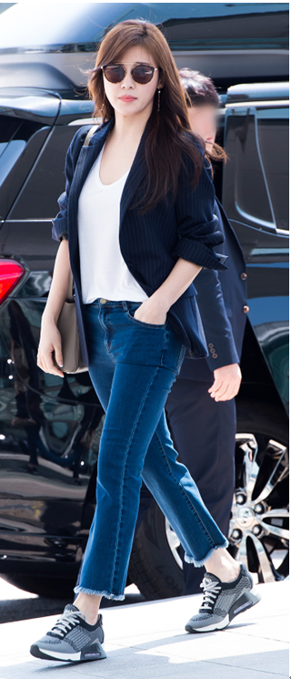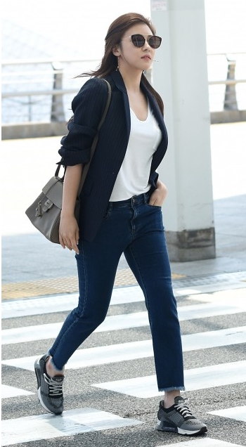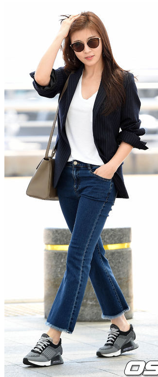 청바지에 세련된 운동화로 가녀린 발목 살짝쿵 보여주는데
