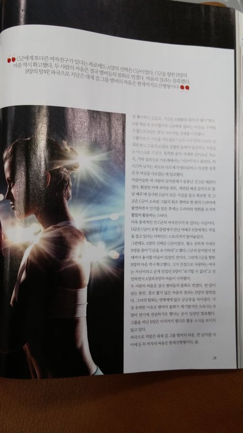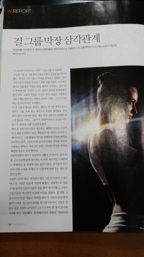 걸그룹은 때로는 귀엽고, 때로는 섹시한 매력으로 사랑받는 그룹. 톡톡튀는 개성으로 무장한 멤버들로 구성. 드라마,영화,예능프로그램까지 다양하게 얼굴을 비치고 데뷔하자마자 빵 떠서 '대세 걸그룹'반열에 오름 맏언니 a 청순╋세련╋흰 피부. 그룹 활동이랑 연기 병행. 한살어린 b 귀여운 외모로 사랑받음 데뷔2년만에 드라마 주인공 둘은 원래 각종 공식석상에 같이 참석하는 등 연예계 대표 절친. c군. 상대적으로 얼굴이 덜 알려짐. 실력파 밴드 그룹의 보컬, 강렬한 눈매와 인상적인 마스크, 독특한 음악세계╋감미로운 목소리╋기타실력. '이단아'라고 불림. 현재 '훈남배우'에 등극한 ,d군은 c군 소속된 그룹의 원조 멤버, 한 편의 드라마에 출연하면서 인기를 얻고 드라마 영화를 오가며 활발히 활동중. 어쨌든 c군이 a양이랑 사귀다가 b양이랑도 사귀면서 양다리가 됐는데 d군이 폭로함. c군 두고 a양이랑 b양이랑 싸우고 결국 b양이 그룹 탈퇴함. 연기에 전념하기로 했다는 공식입장만 발표. 아직까지 별다른 활동소식 없음.