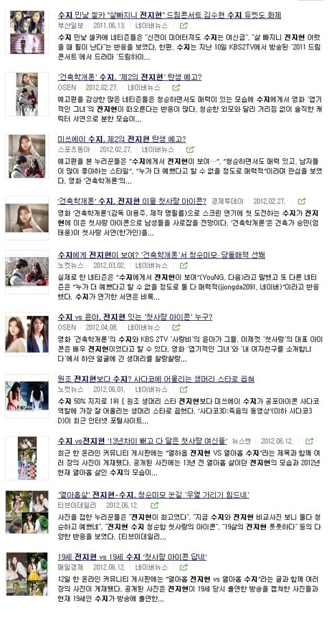 또 수지도 전지현한테 그랬다는 둥 개소리할까봐 지금 검색해서 가져오는데, 수지는 전지현 까내린적은 없다 빼앗았다고 한적도 없고. 수지랑 전지현 둘다 좋게 기사난게 태반이고, 수지가 첫사랑 이미지 얻으니까 예전에 첫사랑이미지였던 전지현이 같이 회자 되면서 둘다 좋은쪽으로 난 기사들이었음