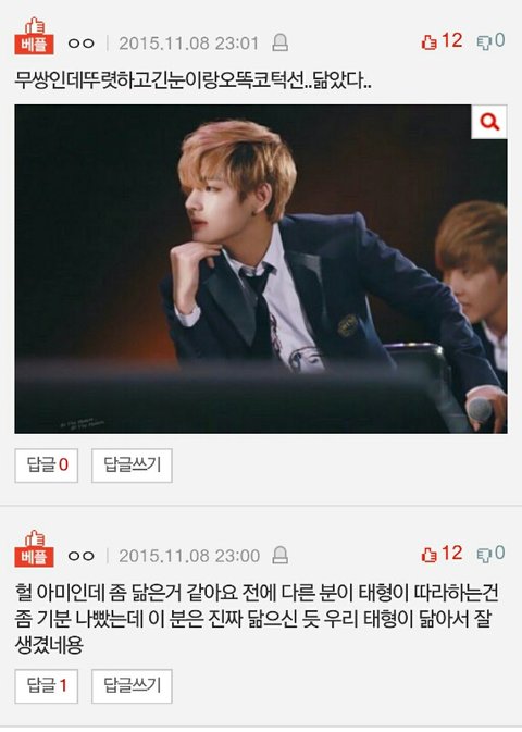 얼굴 전체가 닮은건 아니더라도 눈꺼풀이 직선인거랑 눈썹 등등 눈매 자체가 되게 비슷하지않냐 난 저거때문에 좀 닮았다고 느꼈는데 방탄팬들이 닮았다고 하면 뭐? 태형이랑? 하면서 은근 비꼬더라고ㅋㅋ.. 기분 나쁠 정도로 저 연습생이 못생겼나 나는 어제 처음 본 앤데 잘생겼다고 느꼈음