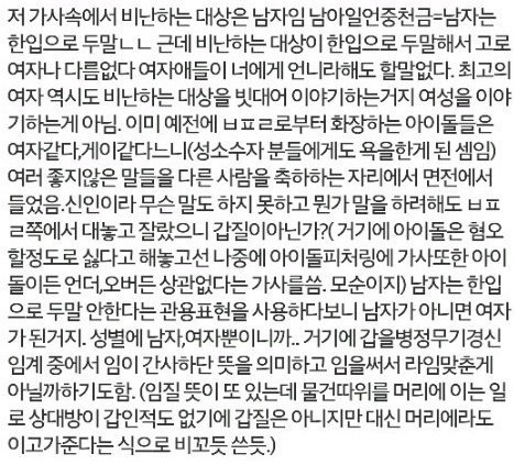 이 외에도 '음식을 눈으로 먹냐 여자애들처럼', '명품 백을 쥐기보다는 내 손을 잡아주는' 이 두 구절이 어째서 여혐인지 나로서는 전혀 이해가 안 간다 나도 음식 먹기 전에 사진부터 찍는 사람 싫어하고 명품 백에 목을 매다는 사람 정말 싫어해 그럼 나도 여혐이니? 애초에 '핸드폰 좀 꺼줄래' 이 노래는 말을 건네는 상대가 여자가 아닌 남자야 남자가 핸드폰 들고 음식 먹기 전에 사진 찍고 그걸 SNS에 올리고 따봉 받고 리트윗 받고 이러는 거 정말 보기 싫지 않아? 그 내용에 대해 말한 거고 명품백만을 선호하는 여자는 사회적으로 그리고 기본적으로 사람들이 별로 안 좋아하잖아 그럼 그 사람들 전부 여혐이니?