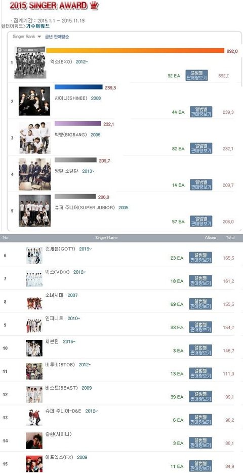 2015년 앨범 총 판매량 순위