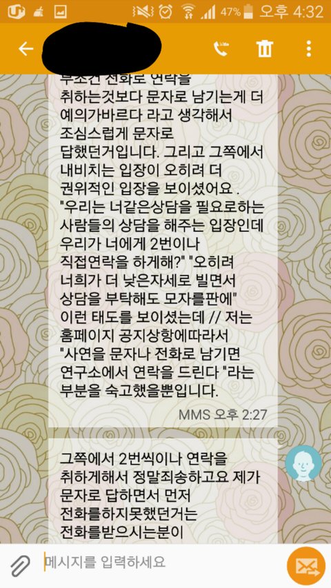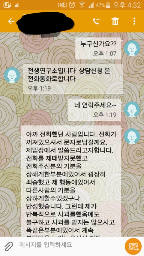 주말이라 늦잠을자느라 늦게 핸드폰을 확인했는데 모르는번호로 두번이나 전화가 왔있더라고요. 근데 제가 상담을 신청했던번호와는 다른번호였고 ,확인차 누구세요?라고 문자를 남겼는데 전생연구소라고 상담신청은 전화통화로 한다고 답장이와서 그럼 연락주세요~ 라고 메시지를 남겼습니다. 얼마안있어서 전화가 와서 받았더니 상담신청받으시는분이 전화상에서 엄청나게 쏘아대시더라고요. 하시는말씀이 "우리쪽에서 전화를 2번씩이나 하게하냐 나이도 어린거같은데 이래서 사회생활어떻게하느냐 예의없게 문자로 전화주세요~라고하는게 매너있는행동이냐!"라는등 제 행동에대해서 엄청나게 몰아붙이시더라고요 .예상치못한 반응에 당황해서 얼어붙은 입을 달래느라 제대로 말도못하고 있는데 그분이 제 잘못에대해 계속 지적하셔서 계속 사과를드렸어요 .제가 늦게 일어나서 전화를 빨리받지못해 기분상하게 해서 진심으로 죄송합니다 . 제가 문자로 누구세요?라고 확인하고 연락주세요~라고 했던것이 예의없고 기분이 나쁘셨다죄송합니다. 저는 정말 기분나쁘게할 의도를 가지고있지 않았고, 오히려 제가무턱대고 전화를하는게 예의가없는거같아 조심스럽게 문자를남긴거였습니다.라고 반복적으로 사과를 드리는데도 계속 제 태도에대해 지적하시더라고요 ." 어 상담을 요구하는사람이 그런식으로 매너없게 하면되냐 우리쪽에서 빌빌거리면서 너한테 두번씩이나 연락하게하고 거기다 예의없게 문자로 연락해달라고하면되냐 "하면서 같은 문제를 계속 언급하시는거에요. 저는 또 거기에 맞춰서 일단 너무죄송하다고 그럴의도는없었다고 사과를 드리는데 계속 듣다보니 제가 드리는 사과는 듣지도않으시고 계속 똑같은 부분에대해 불만만 표하시더니 "다시 상담신청받고싶으면 한시간동안 반성하고 다시연락하라 "하시고 전화를 끊으셨어요....