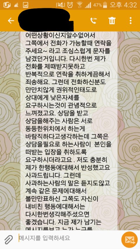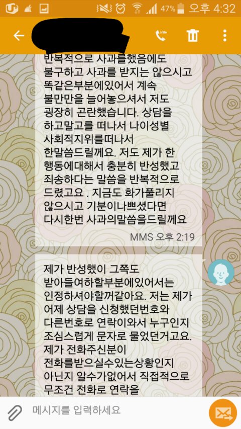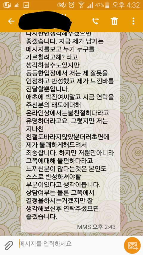 저는 어안이벙벙하고 엄청쏘아붇이셔서 심장이 벌렁벌렁하고 울컥울컥해서 울뻔했는데 이게 무슨일이지? 싶더라고요 . 하지만 그분이 그렇게 느끼셨다하니 저도 계속 제 행동되돌아보면서 계속 사과를드렸던건데 그분은 관념적인 태도로 비난만하시고 제가 어떤 사과를해도 받아줄마음이 없으신것같라고요. *논란이될까봐 밝히는데 상담신청을받으시는분은 박진여씨가아니라 다른 남성분이셨어요 . 아무튼 전화가끊기고 생각을많이해봤는데 제 잘잘못을 떠나 지적질만하시고 남의얘기는 듣지도않으며 중년남성의 목소리였지만 남의말은 듣지않는 고집불통인 아이같더군요 . 상담후기를 찾아보니 박진여씨말고 상담신청받는 분이 불친절하고 남을가르치려고만한다라는 글도있더라고요. 흥분한 마음을 가다듬고 다시 사과도 드리고 제입장에대해서도 말하려고 다시전화를했는데 전화가 꺼져있더라고요... 대체 여태까지 상담을필요로 했던분들이 어떻게 그분의 비위를 맞춰드려왔는지는 모르겠지만 문제가 있는거같은데 여러분들은 어떻게생각하시나요? 전화를안받으셔서 개인적으로 문자로 제입장도 밝히면서 사과할부분은 사과도드리고 그분의 불쾌했던 태도에대해서도 의견을 남겨놓은상황입니다. 그분의 뉘앙스는 "나는 아쉬울게없는 사람이고 너와같이 필요로하는사람이 낮은자세로 우리한테 대접하지 못할망정 우리가 빌빌거리며 두번이나 연락해야하냐" 이거더라고요 . 상담을 하는데에있어서 서로 동등한위치에서 이해하는마음을가지고 하는게 바람직한 상담이아닌가요?? 누가 더 잘나고 못나고를 따지는 마음을 가지신분이 상담과 관련된일을한다는게 굉장히 모순적인것같다고 느껴지네요.... 다른분들의 의견을통해 듣고싶습니다. 혹시나 내가 더 잘못한게있는지 아니면 정말 그분에게 문제가있으신건지 알고싶고 저와 비슷한경험을 하신분들이 궁금하네요 . 직접상담을하시는분은 박진여라는 분이신데 매게체를통해서본 그분은 참 따뜻하시고 열린마음을 가지신분이라고 생각해서 상담을신청했는데 결국 상담신청받으시는 남자분의 비위에 맞지않으면 아무것도 하지못하게 되는거같네요 . 상담을 바라는사람입장에서 굉장이 모순적인 절차방식인것같아 속상합니다. 이런분때문에 박진여 선생님와 인연이 닿을수있는사람 조차 기회를 잃게되는 현실이 마음이아프네요 . 다른분들의 의견이 궁금합니다. 공감하시는부분이있거나 혹시나 저의 잘못이 큰건지 알고싶네요 긴글 읽어주시느라 수고하셨습니다.짧게라도 댓글 달아주시면 감사하겠습니다. 밑에사진은 문제가 된다면 지우도록 하겠습니다.