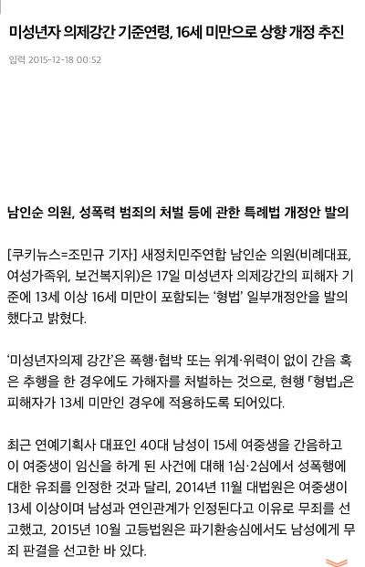 이 년전 부터 의제 미성년법 제청을 했지만, 아직 국회에 계류 중이다는것을 알게 되었습니다. 메스컴에 접한 반대 이유 중에 하나는 악용될 소지가 있고, 미성년 끼리의 성관계시 처벌되면 문제가된다 등입니다.