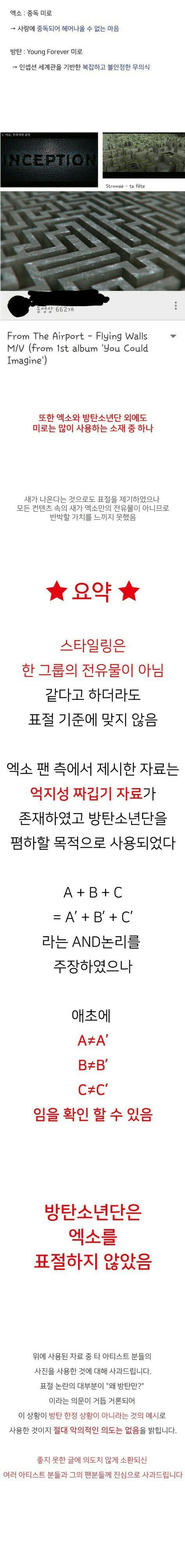 '표절'의 제대로 된 의미는 알고 떠들길.. 앞으로도 해명에 관심없던 사람들은 방탄소년단 하면 표절이라는 꼬리표 따라붙을텐데 신중했어야지. 팬피셜 필요없다고? 팬도 대중이야. 대중은 표현할 자유가 있다며. 팬들은 표절이 아니라고 말할 자유도 없음? 대체 무슨 논리인지.. 게다가 정확한 날짜, 악의적 짜깁기 자료로 반박하는데 할말 있음? 나중에 가서 아니면 말고 식으로 넘길거잖아. 그럼 그동안 욕먹고 상처받은 가수랑 팬들은 어쩌라는거지? 누가 보상해주는데? 대중이라면 표현할 자유 있지. 그치만 '신중'했어야지. 그 신중하지 못한 판단에 수많은 사람들이 마음고생하고 힘들어했다는 거 알길 제발