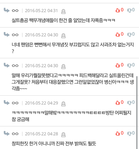 증거 니들이한실트들 전부가수한테밝혀도되냐는 아미말에 밝히라고 창피한짓아니란 반응